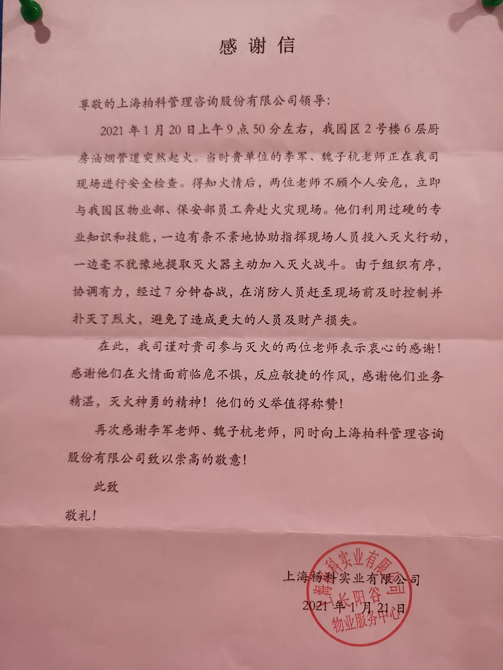 日前,上海柏科管理咨询股份有限公司李军和魏子杭两位咨询老师保护公共财产安全勇于救火的先进事迹受到社会各界的一致好评。他们在企业客户突发的火情中迎难而上,为保护公共财产安全挽回了经济损失,他们高尚的精神和专业的职业素养为柏科公司树立了良好形象,客户企业为表彰两位老师特地写来了表扬信并送来了锦旗。