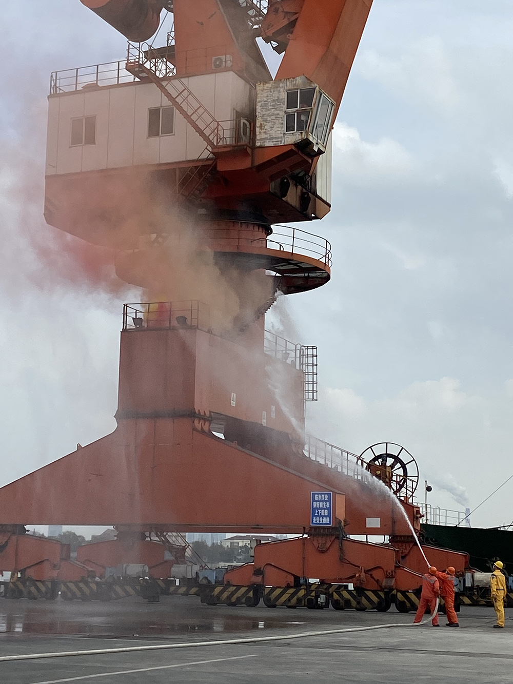 9时45分左右,装卸区门吊正准备从货船甲板起吊装运钢板时,突然发火情。门吊司机观察到有火情时,按正常程序切断门吊操作电源,取出干粉灭火器准备灭火。因电气机房内有大量浓烟无法实施灭火,而且此时门吊司机因烟雾呛入,支撑不住而倒在电气机房门外。