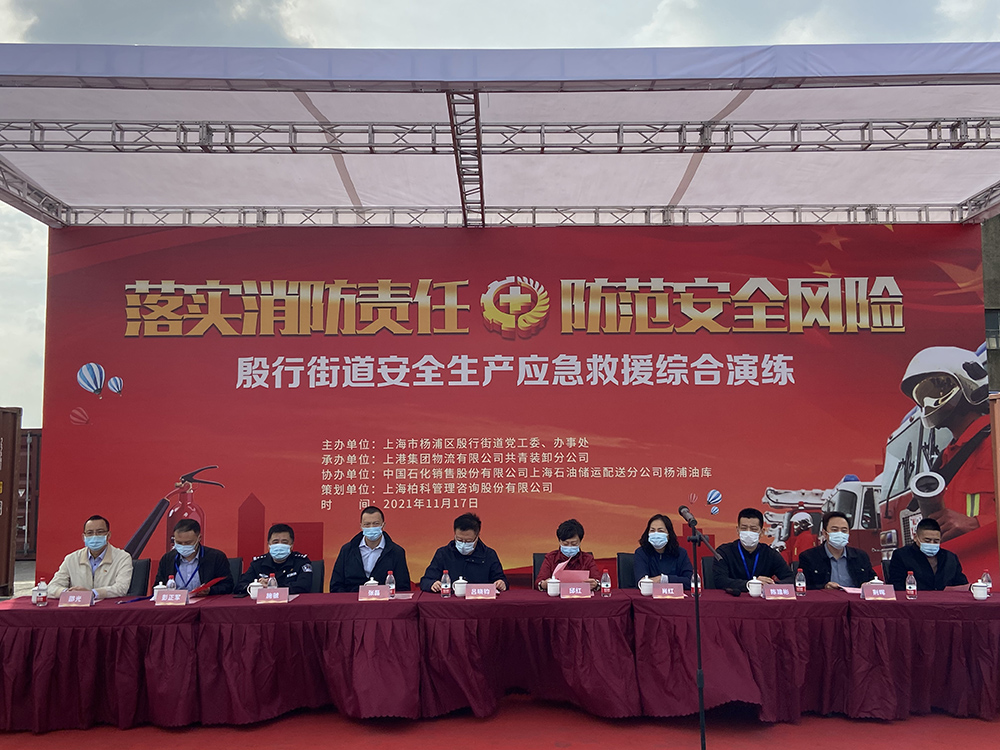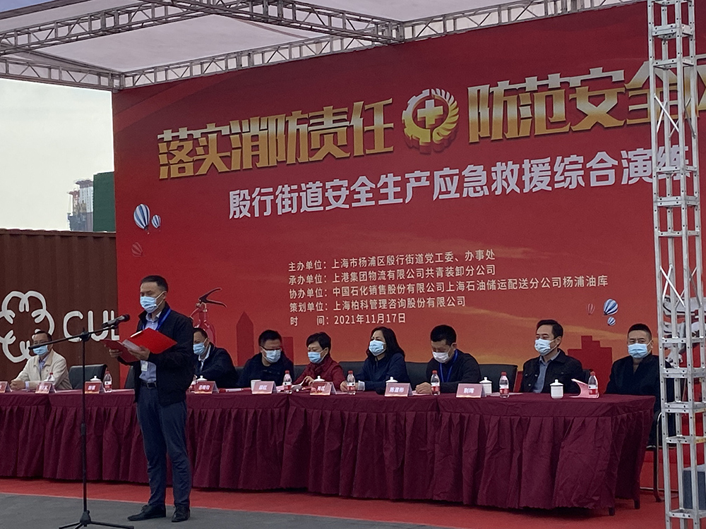 为贯彻积极践行人民城市重要理念,切实把党史学习教育成果转化为抓好安全生产、推动安全发展的实际行动,11月17日,由杨浦区殷行街道党工委、办事处主办,上港集团物流有限公司共青装卸分公司承办,中石化销售股份有限公司上海石油储运配送分公司杨浦油库协办,上海柏科管理咨询股份有限公司策划的”2021年殷行街道安全生产应急救援综合演练”在上港共青码头顺利举办。本次演练活动的主题为“落实消防责任,防范安全风险”。杨浦区应急管理局局长吕晓钧等出席。
