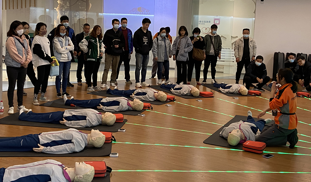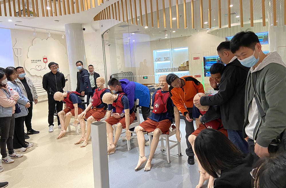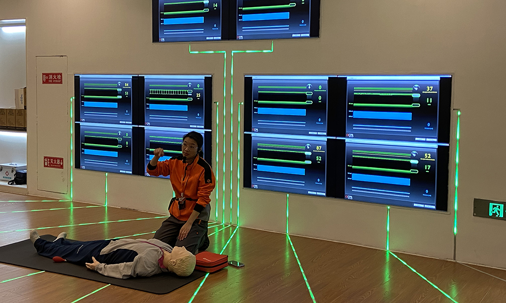 第五阶段的人员急救与应急处置实训演练环节,培训学员在指导老师的带领下前往人员急救与应急处置实训演练地点,首先由指导老师讲解紧急情况下人员急救的重要性与人员急救安全注意事项;随后,学员在指导老师的指导下分别进行海姆立克法急救、心肺复苏急救、体外除颤仪急救与伤员紧急包扎与转运,指导老师在旁进行指导与演示。